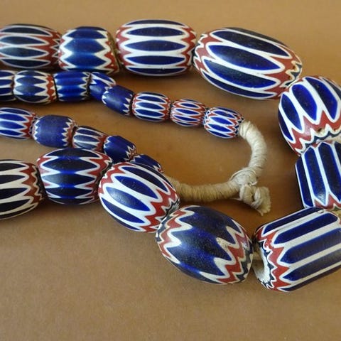 Halskæde med 104 ufuldstændige chevron-perler, 5 lag, fra Murano, ca. 1920, Ghana; længde 86 cm, vægt 300 g, perler ca. 14 mm i diameter med en brun/hvid/brun kerne og en toplag i blå/ hvid/ brun. Klik på den blå "gå til varen" knap, for at købe eller byde på denne vare. Den samlede pris vil blive vist inden du afgiver dit bud.