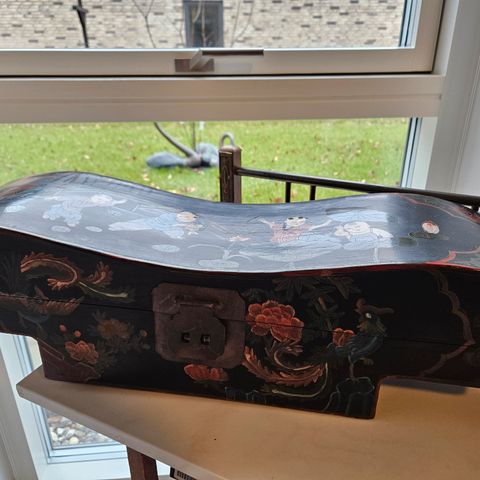 Stor kinesisk chanab-offerboks i Qing-dynastietstil (ca. 1850–1900) af træ med forgyldt og lakkeret dekor, mål 41 × 25,5 × 18,5 cm, vægt 2635 g. Klik på den blå "gå til varen" knap, for at købe eller byde på denne vare. Den samlede pris vil blive vist inden du afgiver dit bud.