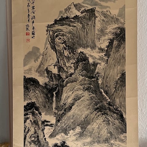 En kinesisk-dynastiets vandfarve maleri på silke, håndsigneret af Shen Zhenlin, med titel Birds on a blossom branch, der skildrer naturen med fugle og sommerfugle, måler 210 cm i højden og 67 cm i bredden og er monteret på papir i Kina, i rimelig stand. Klik på den blå "gå til varen" knap, for at købe eller byde på denne vare. Den samlede pris vil blive vist inden du afgiver dit bud.