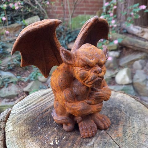 Havefigur i støbt sten af en dæmonisk væsen, 25 cm høj med bredde 15 cm og dybde 20 cm, i fremragende stand og uden underskrift, fra Europa. Klik på den blå "gå til varen" knap, for at købe eller byde på denne vare. Den samlede pris vil blive vist inden du afgiver dit bud.