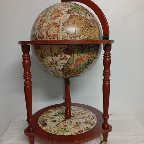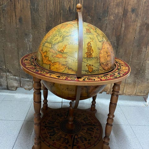 Mappamondo pirtaliquori i træ fra tidligt 1900-tal. Mappamondo bar, mål: højde 1 meter, diameter ca. 50 cm. Sjældent og svært tilgængeligt møbel.