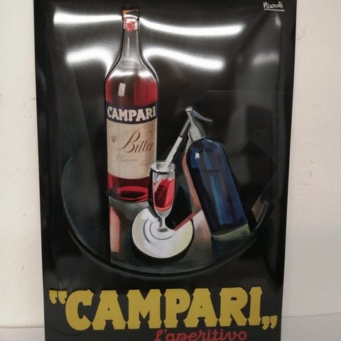 Campari-mærket Fortunato Depero metalvægplade, en reproduktion fra 2000–2010 i jern, måler 100 × 42 × 0,1 cm, vejer ca. 0,5 kg, i pæn stand med mindre aldersmærker, fremstillet i Italien. Klik på den blå "gå til varen" knap, for at købe eller byde på denne vare. Den samlede pris vil blive vist inden du afgiver dit bud.