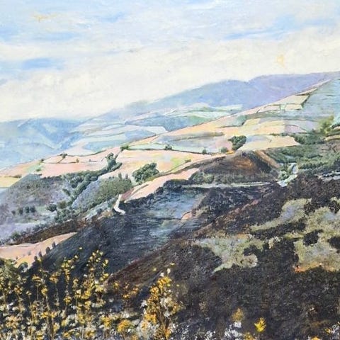 Dette originale værk viser et landligt landskab fra Asturias, med typiske huse fra regionens bjergrige områder, indfanget med en ægte alla prima-tilgang: direkte, frisk og fuld af lys. Det løse og ekspressive penselstrøg videregiver luft, grøn fugtighed og den asturiske landlige ro, som man genkender med det samme.