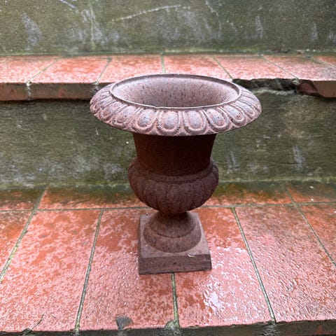Meget tung støbejern havekrukke i smuk rusten farve fra Frankrig.