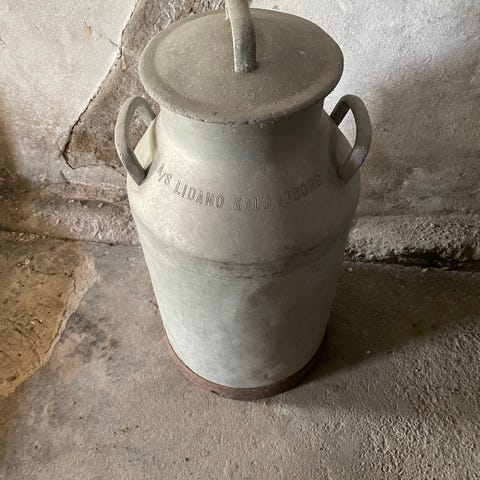 Stor ovalt skulderbærende dunk til transport af mælk.