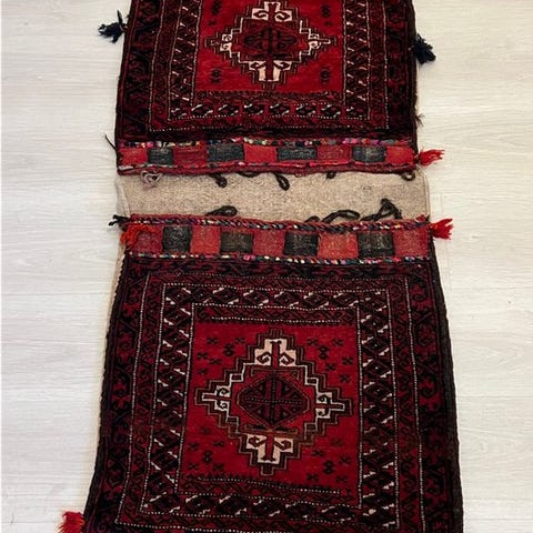 Mafrash (tas) fra Azerbaijan, lavet af uld, ca. 1850–1900, dimensioner 105 cm bred, 45 cm høj, 55 cm dyb, sædebredde 45 cm. Klik på den blå "gå til varen" knap, for at købe eller byde på denne vare. Den samlede pris vil blive vist inden du afgiver dit bud.