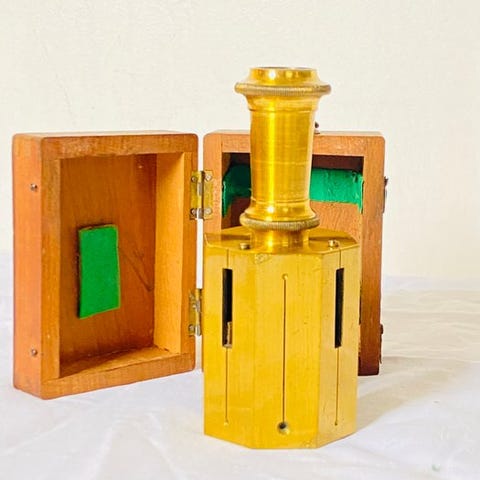 Antik landmåler-theodolit i messinglys, præsenteret i sin oprindelige trææske, underskrevet Erard Fr. Deforges – Opticiens (Rabat, Casablanca, Marrakech, Agadir). Professionelt instrument anvendt til måling af vinkler og topografiske arbejder. Optik med fokusering, præcisionsjusteringsskruer og stabiliseringsbase.