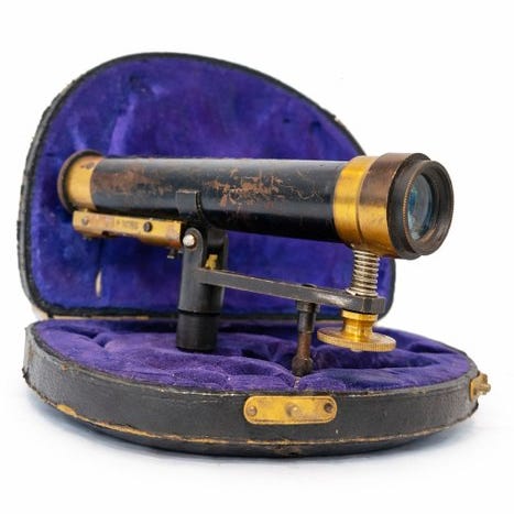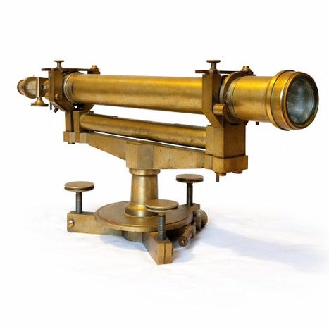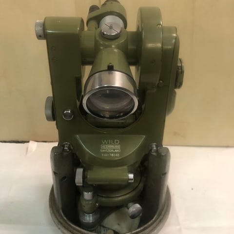 Antikt latons-theodolit til landmåling, underskrevet Erard Fr. Deforges – Opticiens, Frankrig, dateret 1940–1950, testet og i funktion, med original trææske; højde 15 cm, bredde 25 cm, dybde 25 cm. Klik på den blå "gå til varen" knap, for at købe eller byde på denne vare. Den samlede pris vil blive vist inden du afgiver dit bud.