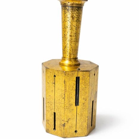 Tilstand i overensstemmelse med alderen med smuk patina på messingen, brugsspor og slid på boksen. En særdeles flot ældre teknisk genstand, eftertragtet af samlere og entusiaster inden for industriel indretning.