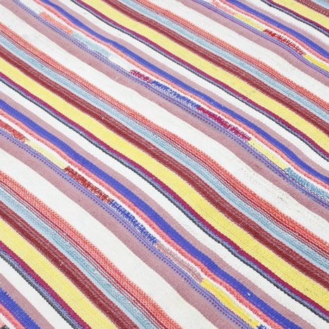 Dette farverige pakistanske Kelim er lavet i traditionelt håndarbejde. Typisk for denne type tæpper er de lyse farver og geometriske stribemønstre, der dannes gennem fladvæv.