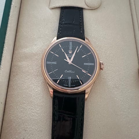 Denne Rolex Cellini Date 50519 har en sort Guilloché-urskive og er lavet af 18K hvidguld, med et produktionsår i 2016.