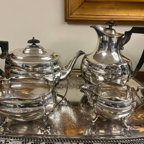 Et udsøgt victoriansk engelsk sølvbelagt tre-delt tesæt bestående af en tekande, en sukkerskål og en mælkekande. Hvert stykke har detaljeret håndgraveret dekoration i Rococo-genoplivningens stil, med indviklede krøllede bladmotiver, blomsterudskæringer og dekorative kartuscher indrammet af perlede og bølgekantede kanter. Sættet viser også elementer fra den æstetiske bevægelse, med geometrisk præcision og stiliserede mønstre, der afspejler de sene 1800-tals kunstneriske tendenser.