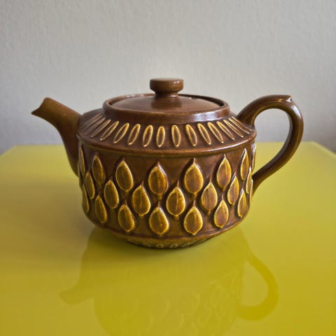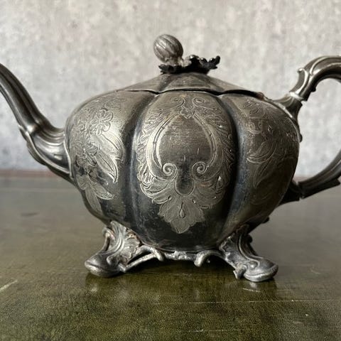 Klassisk victoriansk sølvplet tekande med udsmykket kanthusbladdekoration på tud og håndtag, et centralt ætset kransedesign og en topknop. Har en god hældemekanisme. Nogle mindre overflade-slid, generelt god kvalitet og stand.