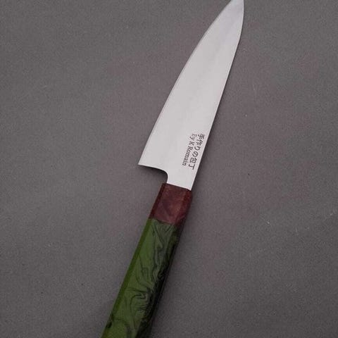 K Romain Gyuto, udformet i samarbejde med japanske håndværkere, indkapsler den perfekte fusion af form og funktion. Smiddet af førsteklasses japansk stål har denne kokkekniv et afbalanceret blad på 8 tommer med en barberknivskarpt kant, ideelt til skiver, hakning og præcisionssnit. De håndsmedede hamon og de subtile graveringer vidner om japansk håndværkskunst. Den ergonomiske, håndsyede træhåndtag giver fremragende komfort og kontrol. Et mesterværktøj for kulinariske professionelle og entusiaster, denne Gyuto er et vidnesbyrd om fusionen af fransk innovation og japansk tradition.