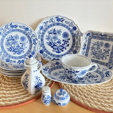 Spisesæt til 6 personer fra den kendte tyske manufaktur Hutschenreuther. De afbildede dele stammer fra kollektionen Zwiebelmuster, også kendt som Blue Onion-designet.