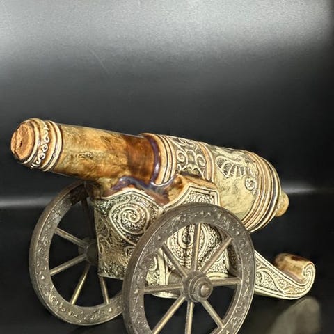 Særdeles flot dekorativ karaffel af keramik, der forestiller en kanon, produceret af Metaxa, det berømte græske brandyhus Metaxa. Denne genstand forener historisk æstetik og anvendelighed: den var designet til at indeholde og servere spiritus, samtidig med at være et dekorativt samleobjekt.