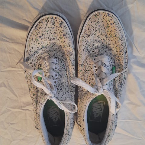 størrelse 45. Laeder Sko er i sort og hvid farve med klassisk Vans design. Materialet er tekstil og gummi. Skoene er velegnede til både hverdag og skateboarding.