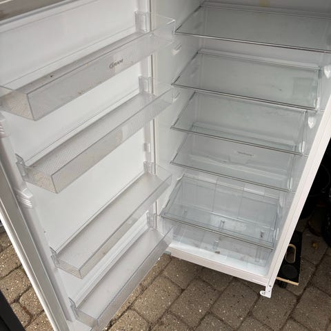Lågen, hylder og skuffen er fra det nye køleskab og derfor helt ubrugte.