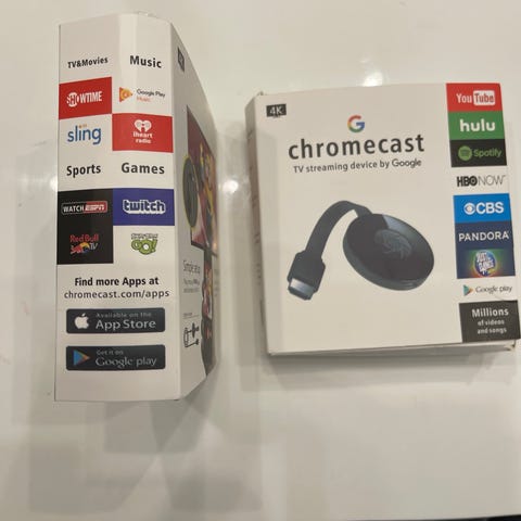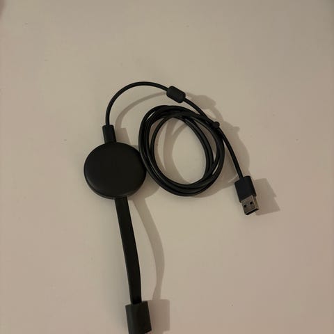 Google Chromecast medieafspiller til streaming af medier. Enheden er sort og leveres med strømforsyning og HDMI-kabel. Kan bruges til at afspille indhold fra forskellige streamingtjenester som YouTube, Netflix, HBO og Viaplay.