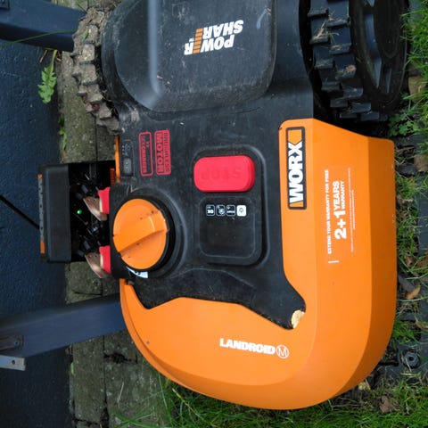 Worx Landroid M robotplæneklipper i orange farve. Designet til automatisk græsslåning med tilhørende ladestation og oplader. Velegnet til vedligeholdelse af plæner. Sælges grundet omlægning af have. Virker perfekt. Købt april 2024