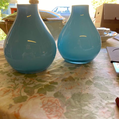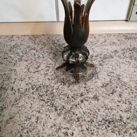 2 stk. rigtig flotte høje og kraftige kobberfarvede glasvaser. H: 34,5 og 34 cm B: 7,5 x 7,5 cm og pyntebånd. Meget dekorative