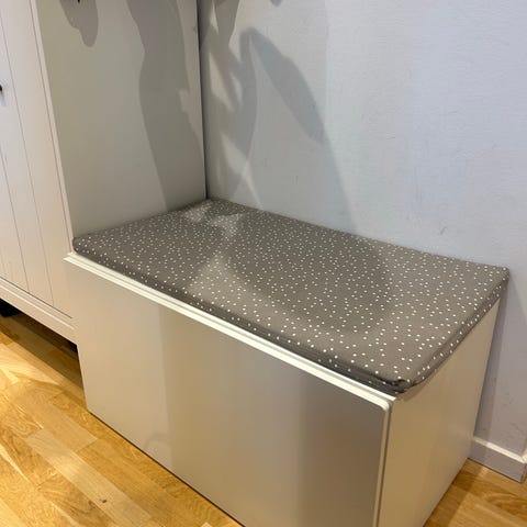 Smuk bænk med skuffer under til opbevaring. Vi har brugt den i vores køkken alrum.