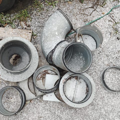 Sæt af metalrør til ventilation med forskellige længder og diameter. Rørene er fremstillet i metal og anvendes til installation af ventilationssystemer.