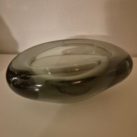 Holmegaard skål i klart glas med en bølget kant og tekstureret overflade. Skålen har et dekorativt design og kan anvendes til lys eller som pynt.