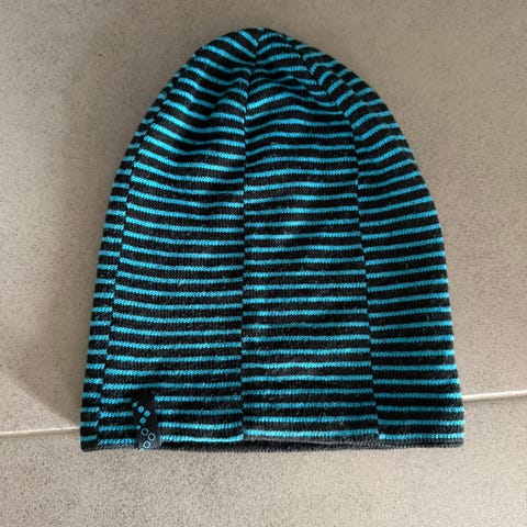 unisex hue i polyester i størrelse one size. Huen har en kombination af blå og lilla farver med en hvid indvendig foring. Den er designet til børn og har en justerbar lukning bagpå.
