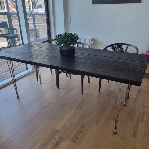 Da Jeg flytter sammen med min kæreste sælger jeg det her Plankebord / Spisebord i træ med metalstel. De er løse, så man kan fjerne bordpladen Bordpladen består af brede træplanker med synlige knaster og en naturlig træfinish. Bordet måler 180 cm i længden og 80 cm i bredden. Stellet er lavet af sort metal med en enkel og funktionel konstruktion. Velegnet til spise- eller arbejdsområde. Der plads til 6stole.