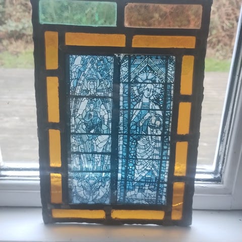 Et rektangulært blyindfattet glasvindue med et farverigt motiv. Vinduet består af flere farvede glasstykker omkranset af blyprofiler og har en kæde til ophængning.