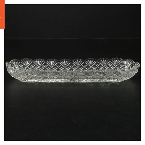 Et dekorativt glasfad på fod med detaljerede slibninger. Fadet har et klassisk design med forskellige mønstre, herunder ruder og stjerneformet slibning i bunden.
