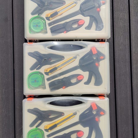 Hobbyværktøj bestående af urmagerskruetrækkere, multimeter, miniborsæt m.m.