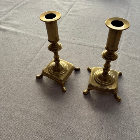Et par vintage messing lysestager med sekskantede baser. H 18,5 cm