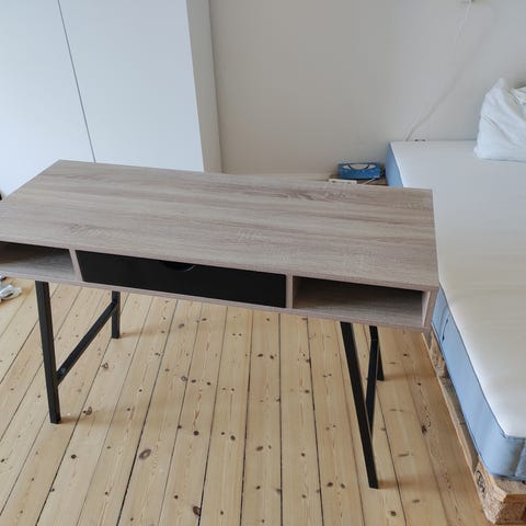 skrivebord med opbevaringsrum og sort kontorstol
