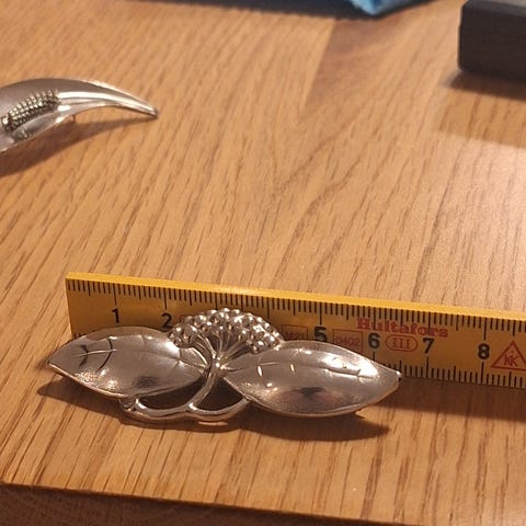 Et dygtigt håndlavet kvalitetsstykke i naturalistisk stil - formet som et 3-dimensionelt håndgraveret bladmotiv - virkelig brugbart - stangen har nålen bagved, og bladdelen hænger frit nedenunder - en smuk vintage patina i sølvet