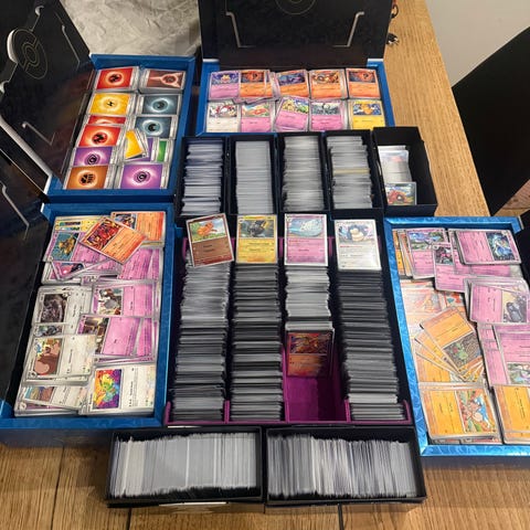 - 1 kasse med blandet holo/reverse fra Scarlet & Violet samt lidt fra Mega Evolution. Har ikke talt dem men der er mange