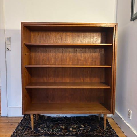 Smuk, ældre reol i teaktræ. Reolen har tydelig patina og aldersrelateret slid, men fremstår stadig fin.