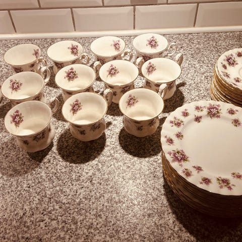 Stellet står som nyt- Stellet er til 6 personer, Store tallerkener 26 cm i diam. frokosttallerkener 21 cm, 6 dybe tallerkener 23 x 19 cm, dyb rund skål 24 cm , sovseskål, Marmeladekrukke. Serveringsfad-