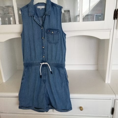Tommy Hilfiger pige jumpsuit i blå farve, lavet af bomuld. Designet til piger i størrelse 92. Jumpsuiten med kort buks, den har knaplukning foran og et bælte i taljen. Som ny - uden brugsspor. Fra dyre- og røgfrit hjem. Kan afhentes i Brøndbyvester, eller sendes for købers regning. Følg min profil - køb flere stk. og spar porto
