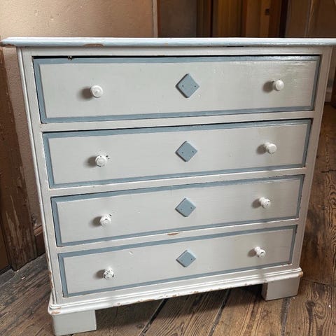 Gammel kommode der er malet med hylder der ikke ligefrem er softclose, men vi har været glade for den som lidt ekstra opbevaring på børneværelset.