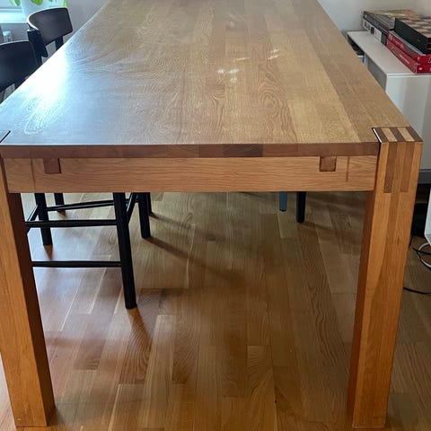 Træbord med 2 plader. Længde med begge plader 2 meter. Hver plade er 40 cm. Det trænger nok til en slibning af bordpladen.