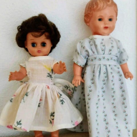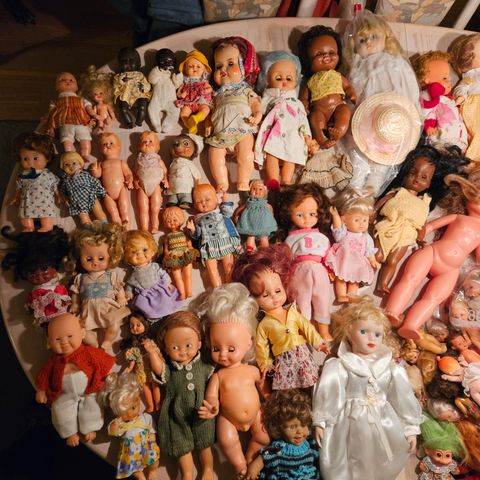 Billederne viser en samling af gamle dukke dele, der inkluderer torsos, lemmer og hoveder. To af dukkerne bærer delvist tøj, en med strikket trusse og den anden i en hvid ble. Der ser ud til at være slid på overfladerne og tøjstoffet er delvist lappet. Håret på en af dukkerne ser ud til at være lavet af syntetisk materiale eller uld.
