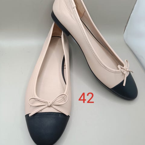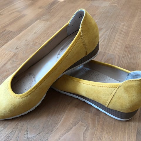 Denne vare er et par guldfarvede ballerina sko til børn. Skoene har flade såler i en mørkere farve og elastiske stropper over vristen for bedre pasform og komfort. På skoens tå er en lille sløjfe, der giver et dekorativt udtryk. Størrelsen er 23.