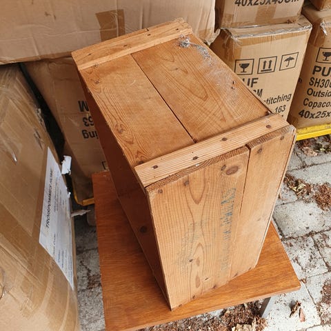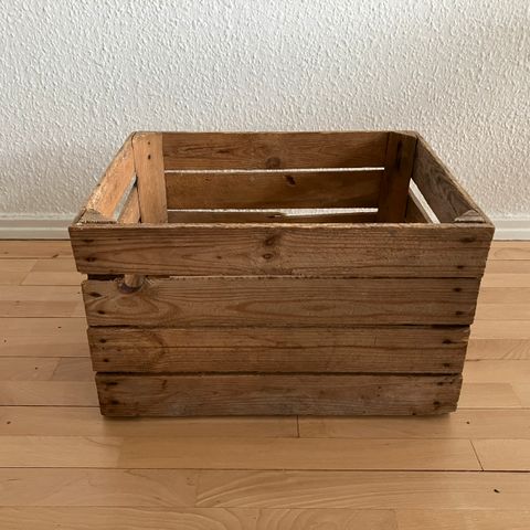 Denne kasse er lavet af træ og har en størrelse på 16x10x6 cm. Den har en horisontal åbning med et dæksel, der kan åbnes ved hjælp af metalhængsler. Siderne af kassen er dekoreret med et unikt mønster, som består af røde stjerner og buet firetalsformet detalje mod en gul baggrund.