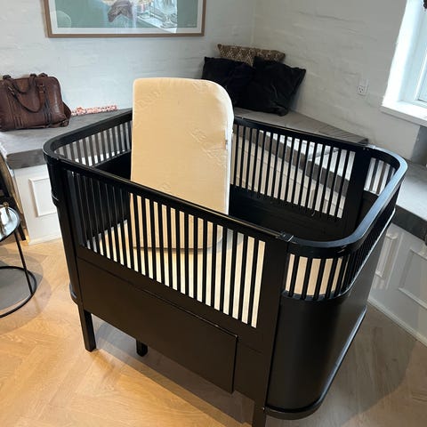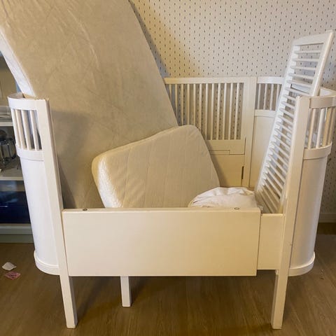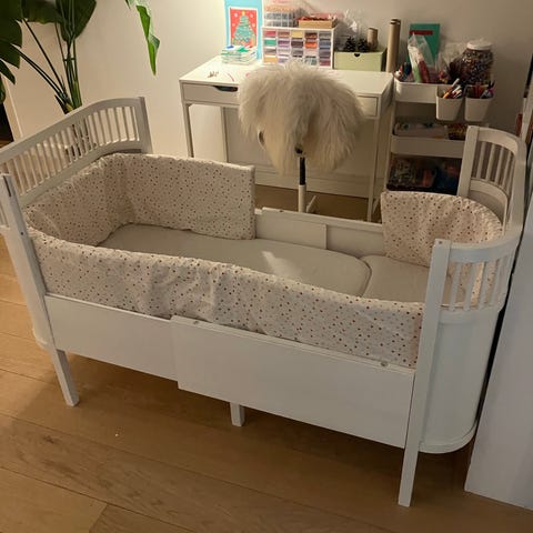 Sebra udtræksseng til børn i hvid. Sengen kan udvides for at give ekstra soveplads og er designet til børneværelser. Medfølgende sider haves ikke.