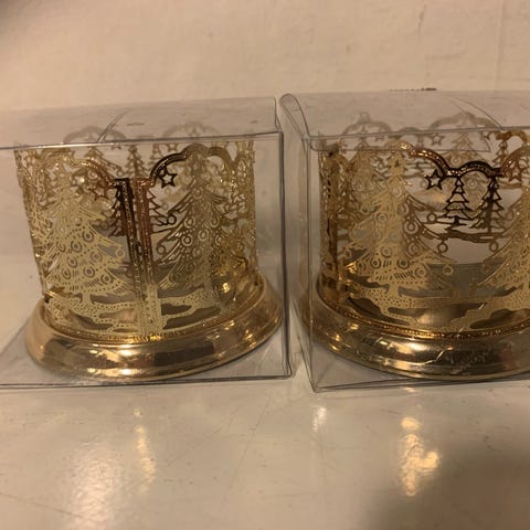 Guld fyrfadsstage med et design af udskårne grantræer rundt om toppen. Stagen er rund og har fire små kugleben i bunden, der giver det et hævet udseende. Det er dekoreret med gyldne detaljer og er lavet til at holde et standard fyrfadslys. Størrelse: Ø 6x9 cm.