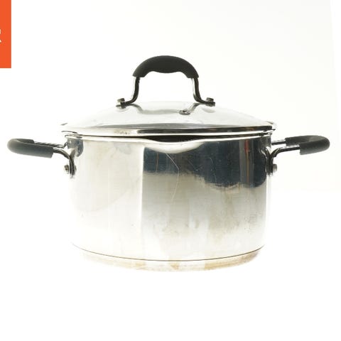 Denne runde gryde har en diameter på 27 cm og en højde på 8 cm. Den er lavet af robust materiale og kommer med et passende glaslåg, der har en sort knop til let løftning. Gryden har to håndtag på hver side til nem håndtering.