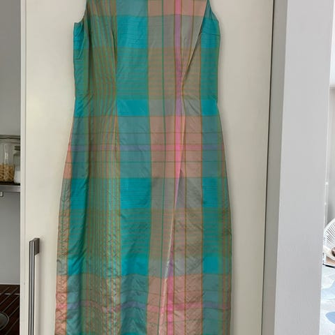 Let kjole i 100% silke fra britiske Farhi. Den har en firkantet hals med en halv sløjfe i den ene side. I midten foran og bagpå er den rynket i taljen.