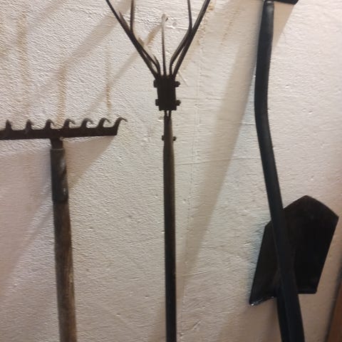 Sæt bestående af havegreb, hakkejern,kultivator,fiskers graverierne og fiskers spade med træskaft og metalhoveder. Redskaberne er velegnede til havearbejde som at løsne jord, grave og flytte materiale. Samlet pris 350